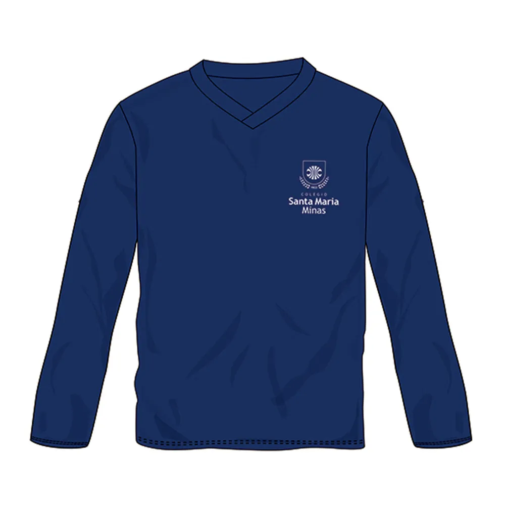 Suéter de tricot com logo personalizada da escola, com detalhe de gola em V